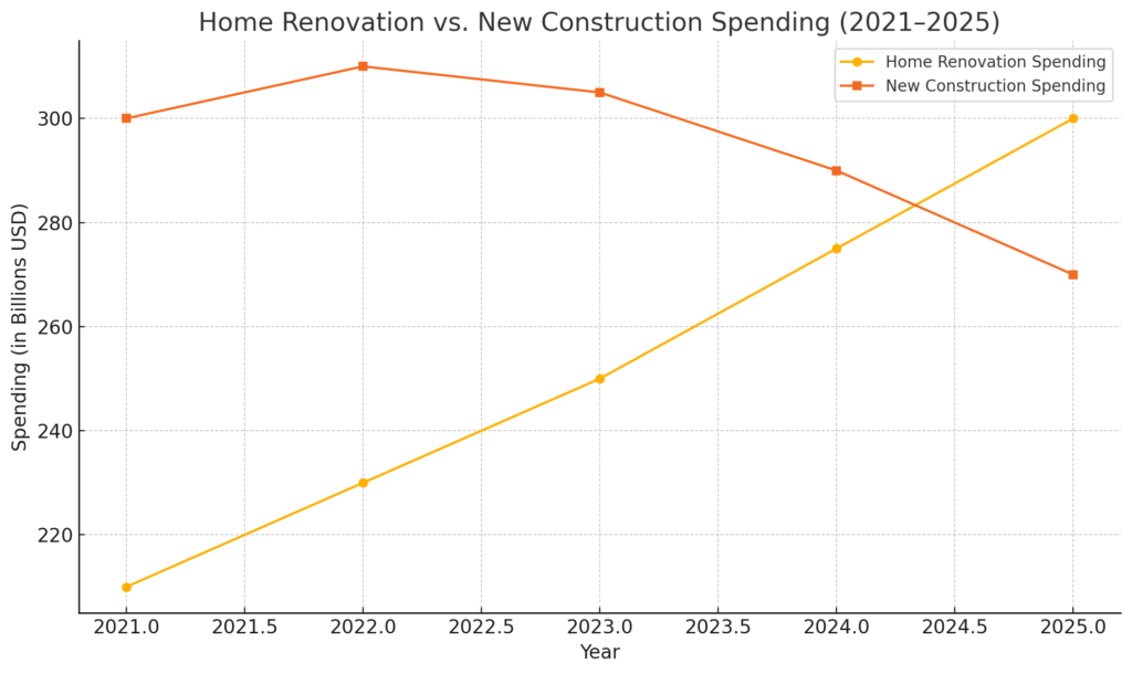 Here’s a visual comparison showing how home renovation spending is projected to rise through 2025, while new construction slows down, a clear signal that homeowners are choosing to improve rather than move.
